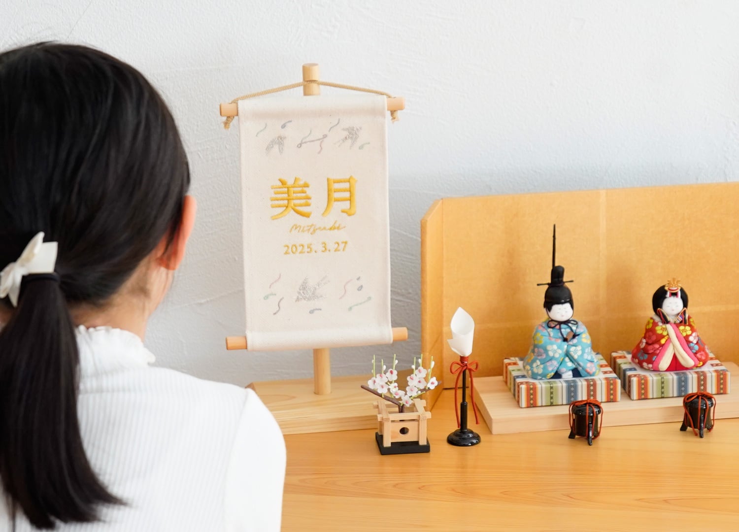 お子さま命名刺繍タペストリー ( スタンド付) エクリュ / つばめ柄|命名旗 |命名書|名入れ刺繍|国産良質素材|遠州浜松産