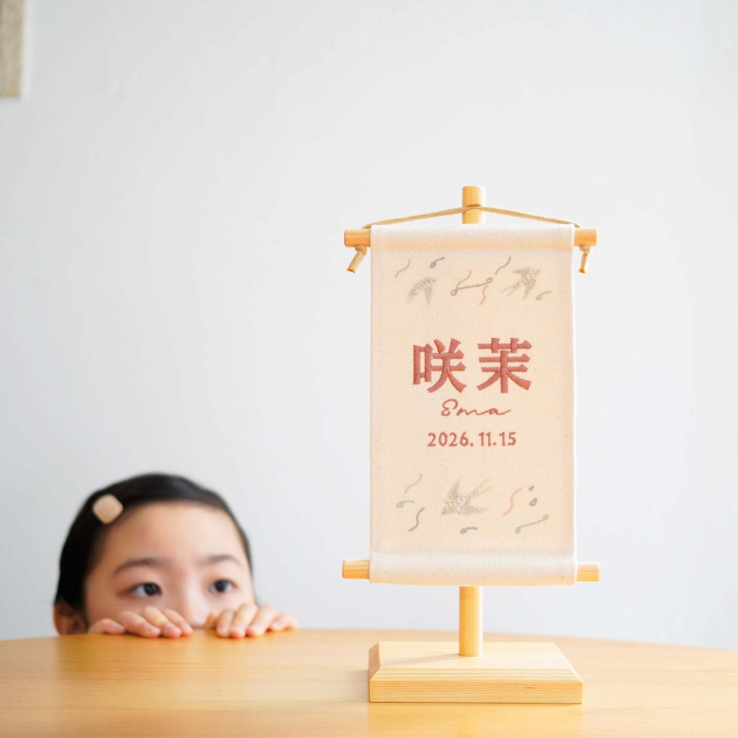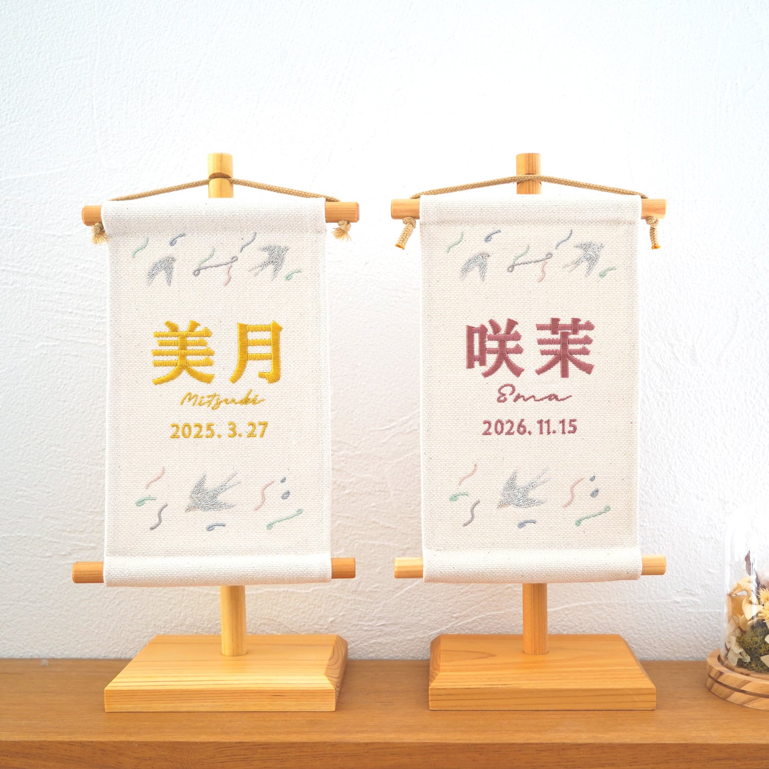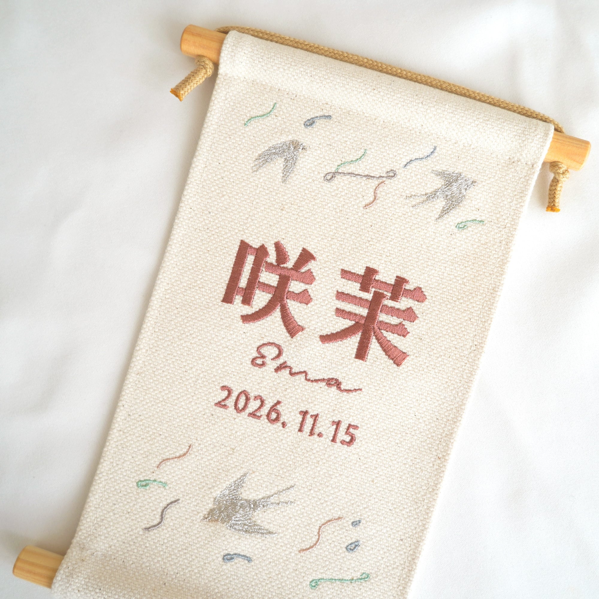 お子さま命名刺繍タペストリー ( スタンド付) エクリュ / つばめ柄|命名旗 |命名書|名入れ刺繍|国産良質素材|遠州浜松産