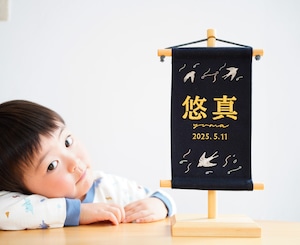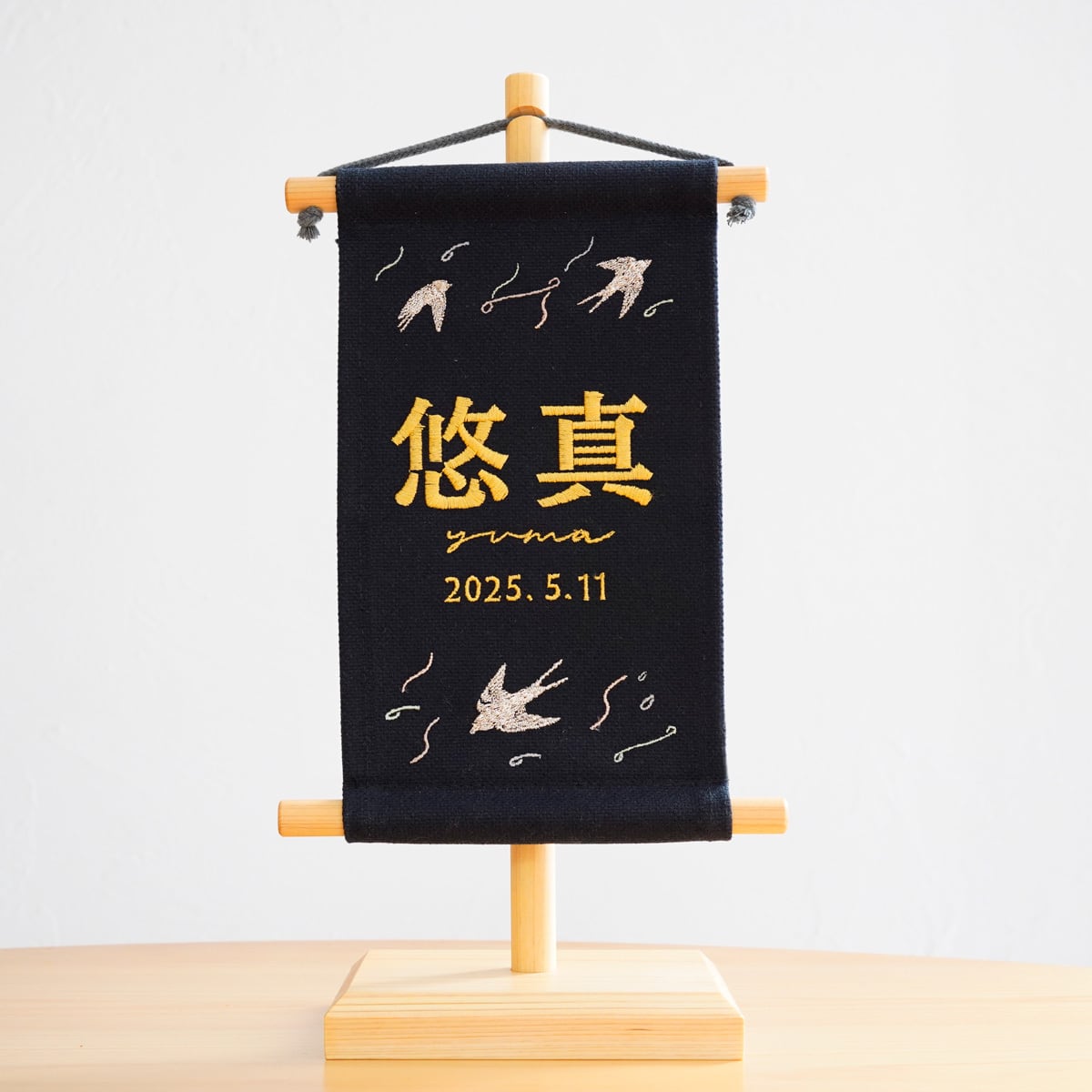 お子さま命名刺繍タペストリー( スタンド付)ネイビー / つばめ柄|命名旗 |命名書|名入れ刺繍|国産良質素材|遠州浜松産